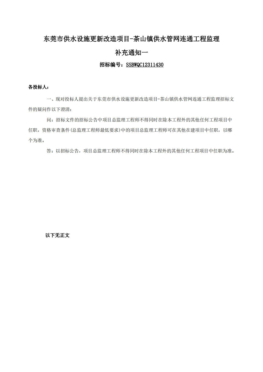 东莞市供水设施更新改造项目-茶山镇供水管网连通工程监理 补充通知一